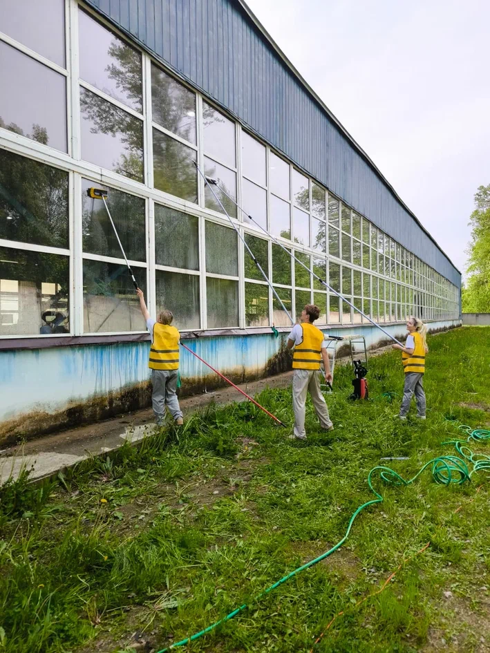 Для работы используем телескопические штанги, профессиональные склизы, безворсовые салфетки из микрофибры и моющие системы с чистой водой.